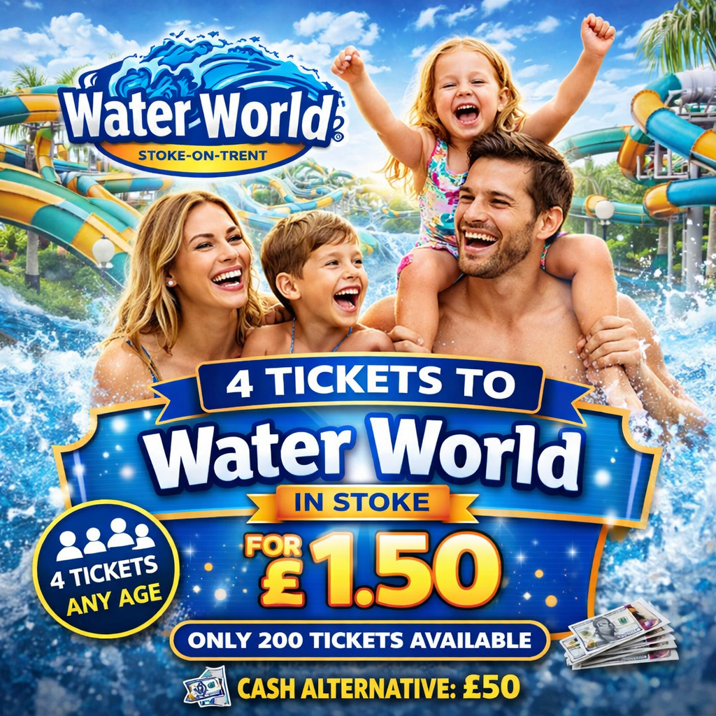 Be in with a chance of winning 4 tickets (ANY AGE) to Waterworld Stoke-on-Trent β€” the UK’s ultimate indoor waterpark! 🌊🎒